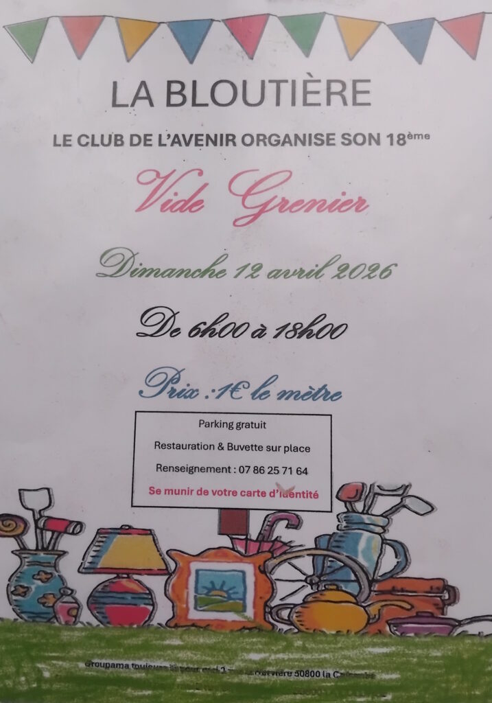 Vide grenier à La Bloutière Auteur/autrice de la publication :Patrick LECOMTE Publication publiée :8 février 2026 Post category:Activités et animations / Actualités / Centre Manche – Granville Villedieu Commentaires de la publication :0 commentaire Dimanche 12 avril 2026, vide grenier organisé par le club de l'avenir de La Bloutière. Read more articles Article précédentConcours de Belote à La Bloutière Vous devriez également aimer Un nouveau Président à la FMCR 20 juin 2024 LE TATTOO DE LA LIBERTÉ 14 mars 2024 Les secrets de la RIA D’ETEL 26 février 2025 Laisser un commentaire Annuler la réponseVous devez être connecté pour publier un commentaire.